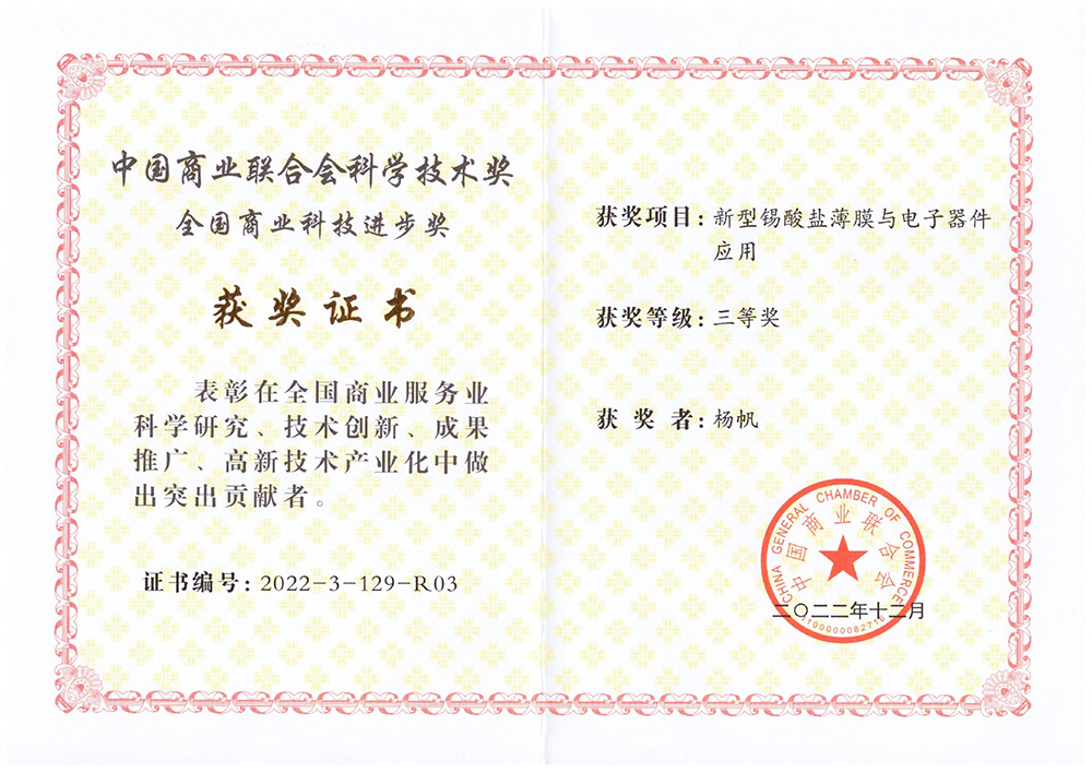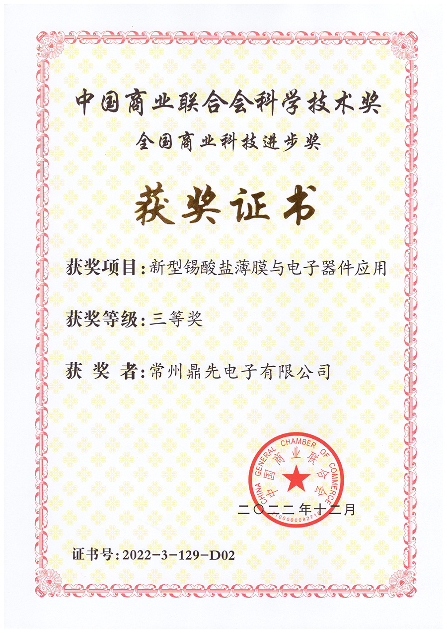 由中国商业联合会主办的2022年全国商业科技质量大会发布了2022年中国商业联合会科学技术奖评选结果。常州鼎先电子有限公司所作为参与单位,联合常州工学院申报项目《新型锡酸盐薄膜与电子器件运用》获得2022年度中国商业联合会科学技术进步奖三等奖。